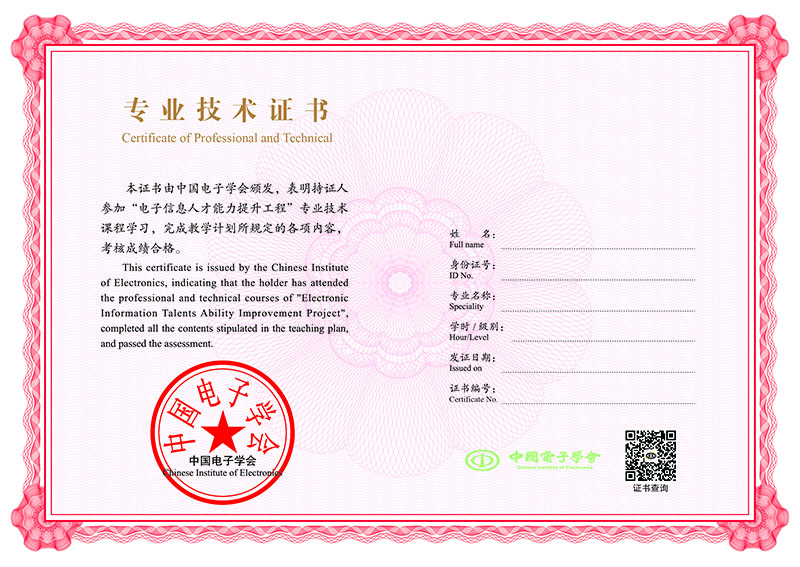 培训结束,经考核合格颁发中国电子学会“电子信息人才能力提升工程”专业技术证书。本次学习情况可记入《专业技术人员继续教育证书》或学习档案,作为对专业技术人员考核评价、岗位聘用、职称评聘和执业注册的重要依据。